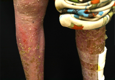 2月25日,醫(yī)院立即組織專(zhuān)家進(jìn)行中西醫(yī)全面會(huì)診,包括醫(yī)院特需專(zhuān)家:北京協(xié)和醫(yī)院原皮膚科主任王家璧教授、北京安貞醫(yī)院原皮膚科主任殷致宇教授、北京大學(xué)人民醫(yī)院主任醫(yī)師張文娟教授、中日友好醫(yī)院中西醫(yī)結(jié)合主任醫(yī)師宋佩華教授等。經(jīng)會(huì)診,專(zhuān)家們發(fā)現(xiàn),小韋紡的皮損面積高達(dá)95%,如頭面部、四肢軀干、臀部及隱私部位均被銀屑病皮損覆蓋。同時(shí),醫(yī)生發(fā)現(xiàn)小韋紡還患有特應(yīng)性皮炎,病情十分復(fù)雜。